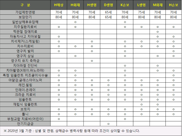 *L생명과 M화재는 재립식 임플란트를 보장한다. 즉, 기존 임플란트를 제거 후 다시 심어도 100만원 정도의 비용을 준다는 것이다. 만약 50세 이전에 임플란트를 한다면 두 보험사를 기억해야 겠다.