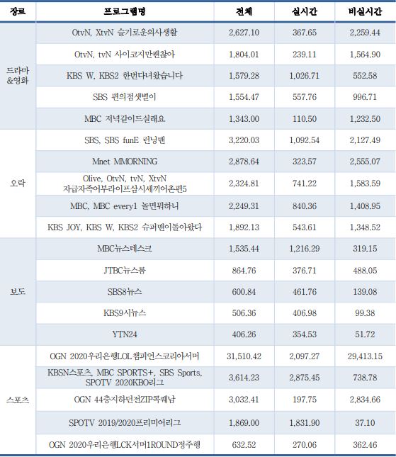 o 장르별 이용시간 기준 상위 프로그램을 살펴보면, 드라마&영화 장르는 OtvN, XtvN ‘슬기로운 의사생활’이었으며, 오락 장르에서는 SBS, SBS funE ‘런닝맨’, 보도 장르에서는 MBC ‘MBC뉴스데스크’, 스포츠 장르에서는 OGN ‘2020우리은행LOL챔피언스코리아서버’로 조사됨 (단위: 만분)