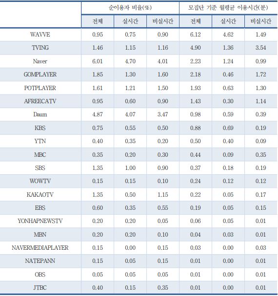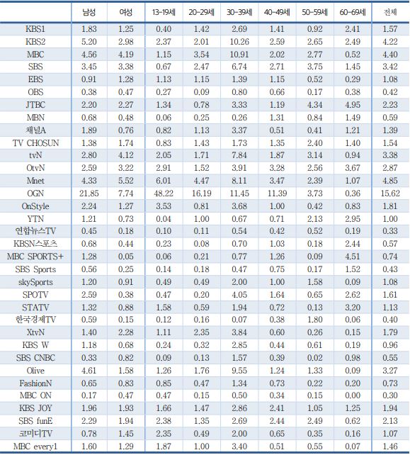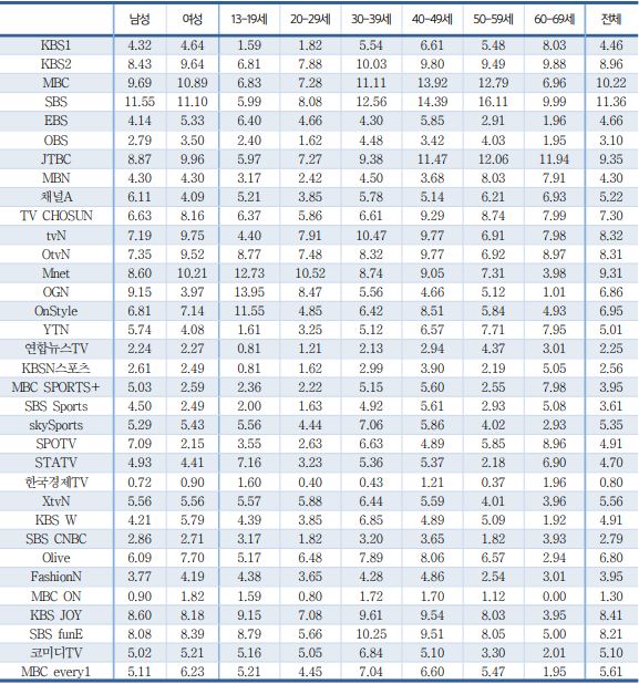 o 채널별 월평균 순이용자 비율은 SBS(11.36%), MBC(10.22%), JTBC(9.35%) 순으로 나타났으며, 남성과 여성 모두 SBS에서 순이용자 비율이 각각 11.55%, 11.10%로 가장 높게 조사 됨. 연령별로 10대는 OGN(13.95%), 20대는 Mnet(10.52%), 30~50대는 SBS(30대: 12.56%, 40대: 14.39%, 50대: 16.11%), 60대는 JTBC(11.94%)에서 순이용자 비율이 가장 높은 것으로 나타남.