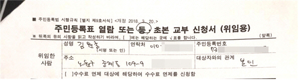 지난 8일 배송 중 숨진 고 김원종씨(48)의 산재보험 적용제외 신청서(위)와 김씨와 같은 대리점에서 일하는 다른 택배노동자 신청서의 필적이 유사하다. 양이원영 더불어민주당 의원 제공