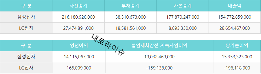 #삼성전자 #LG전자 #엘지전자 #전년도 #매출액 #영업이익 #당기순이익 #비교 #자산총계 #부채총계 #자본총계 #매출액 #영업이익 #법인세차감전계속사업이익 #당기순이익