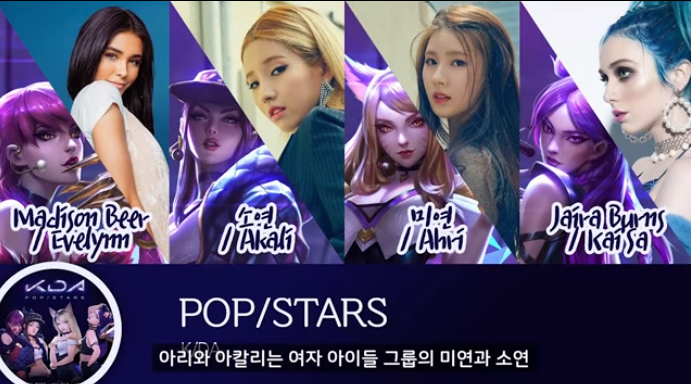 6. KDA는 아리가 맴버를 모아서 만든 k-pop형식의 걸그룹인데 공개 된 영상 찾아보시면 센터를 아리가 아닌 세라핀이 차지하고 있고 중국인 캐릭터이고 현재 사람들 사이에서 추가로 공개될 KDA 노래에서 세라핀이 중국어로 노래를 부르는 것이 아니냐는 소리까지 나오고 있다. 한마디로 세라핀 컨셉이 KDA성덕인데 KDA맴버들을 까는 인게임보이스 (중국어들어간 케이팝, KPOP은 이제 중국 스타일)