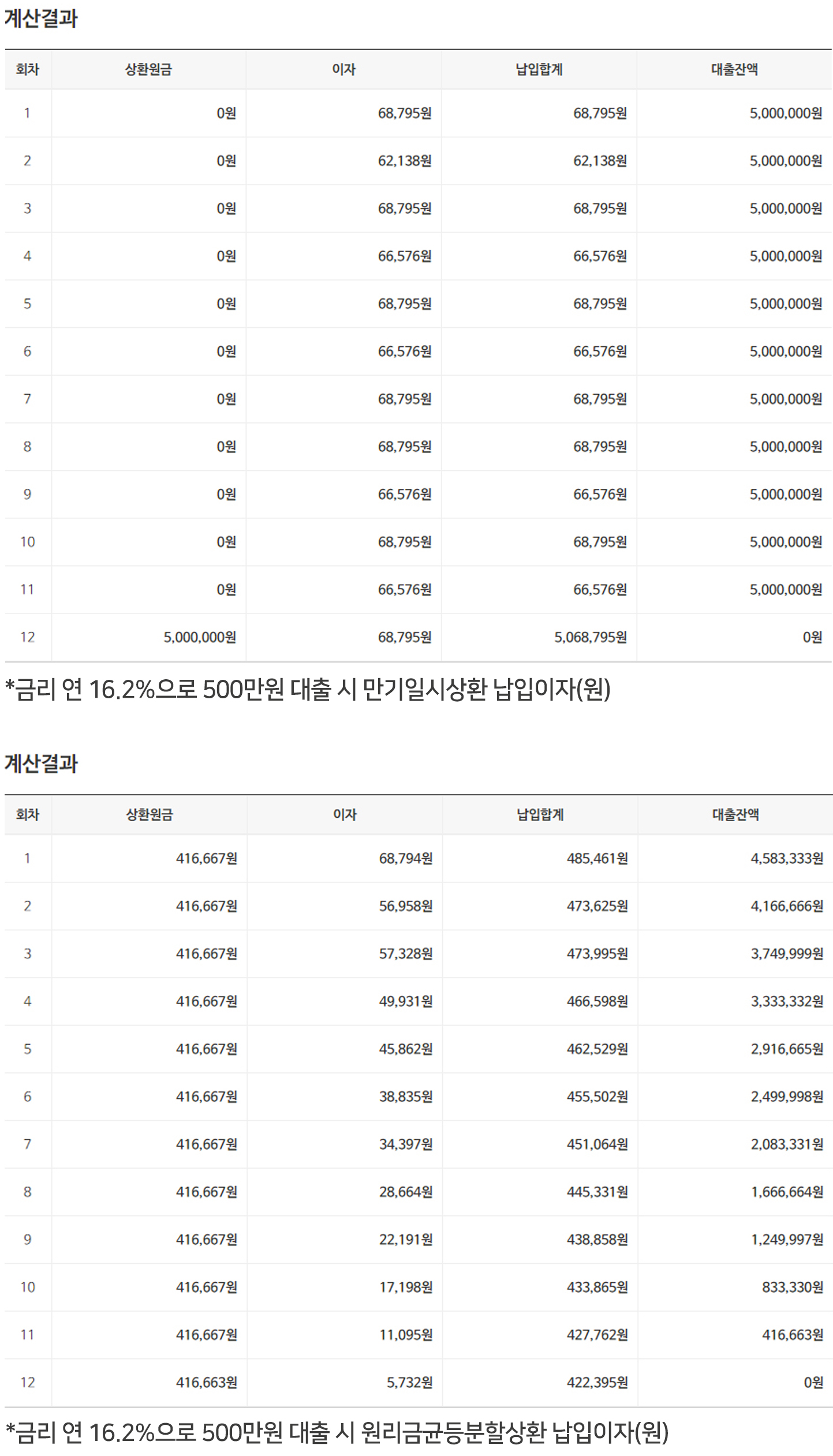 금리 연 16.2% 로 500만원 대출 시 납입이자(원)