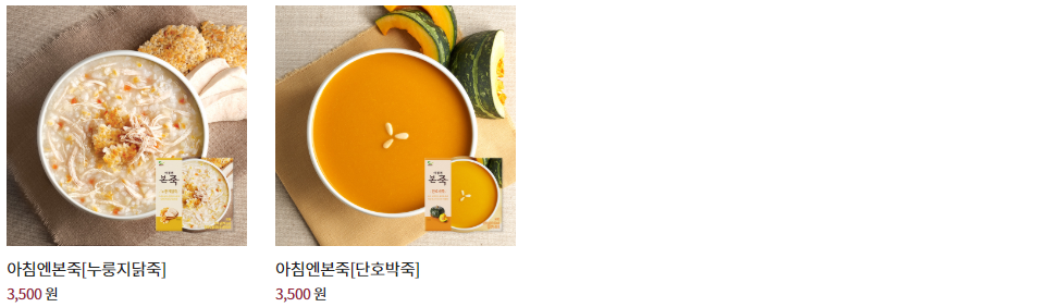 | 아침엔본죽[누룽지닭죽] | 아침엔본죽[단호박죽] | ||