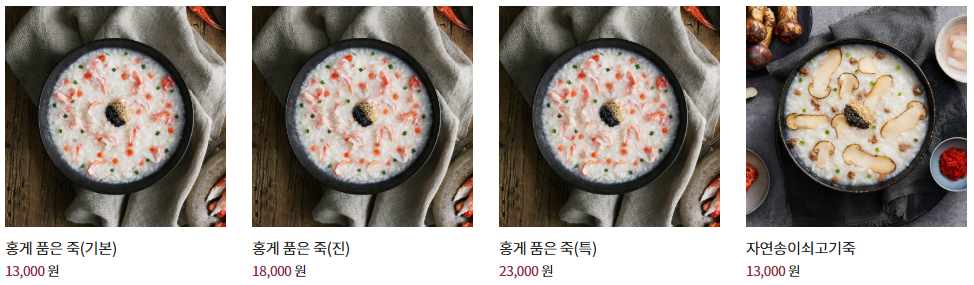 | 홍게 품은 죽(기본) | 홍게 품은 죽(진) | 홍게 품은 죽(특) | 자연송이 쇠고기죽 |