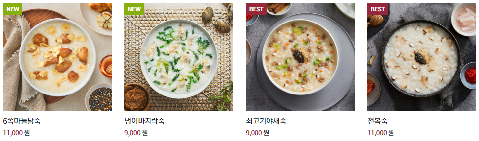 | 6쪽 마늘닭죽 | 냉이바지락국 | 쇠고기야채죽 | 전복죽 |