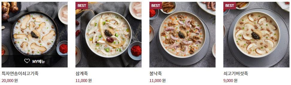 | 특자연송이쇠고기죽 | 삼계죽 | 불낙죽 | 쇠고기버섯죽 |