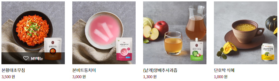 | 본황태초무침 | 본비트동치미 | (낱개)양배추 사과즙 | 단호박 식혜 |