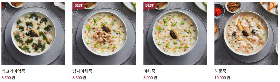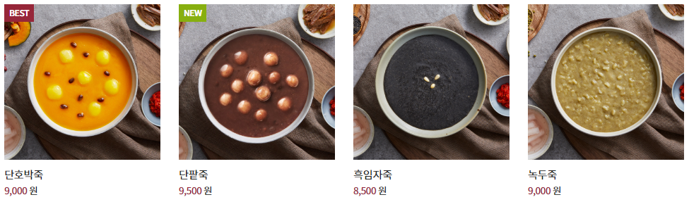 | 단호박죽 | 단팥죽 | 흑임자죽 | 녹두죽 |