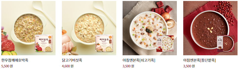 | 한우참깨애호박죽 | 닭고기버섯죽 | 아침에본죽[쇠고기죽] | 아침엔본죽[통단팥죽] |