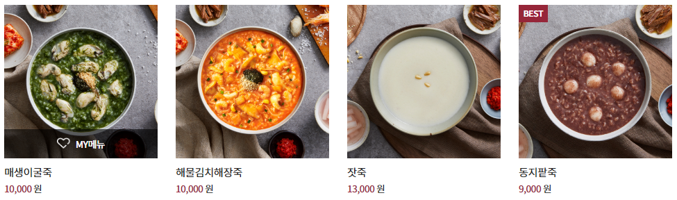 매생이굴죽 | 해물김치해장죽 | 잣죽 | 동지팥죽 |