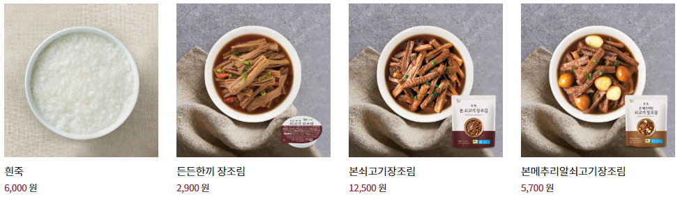| 흰죽 | 든든한끼 장조림 | 본쇠고기장조림 | 본메추리알 쇠고기장조림 |