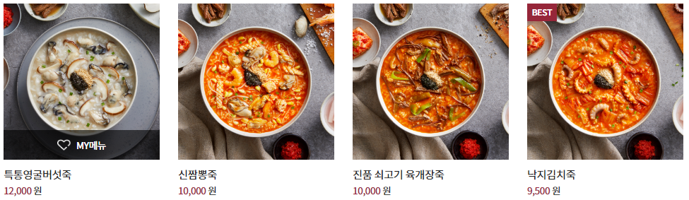 | 매생이굴죽 | 해물김치해장죽 | 잣죽 | 동지팥죽 |