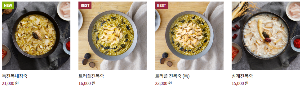 | 특전복내장죽 | 트러플전복죽 | 트러플전복죽(특) | 삼계전복죽 |