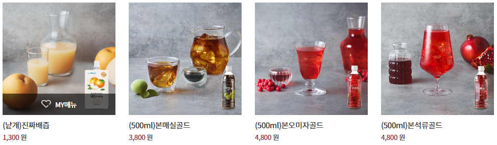 | 진짜배즙 1팩 (100ml) | 매실 원액 500ml | 오미자 원액 500ml | 석류 원액 500ml |