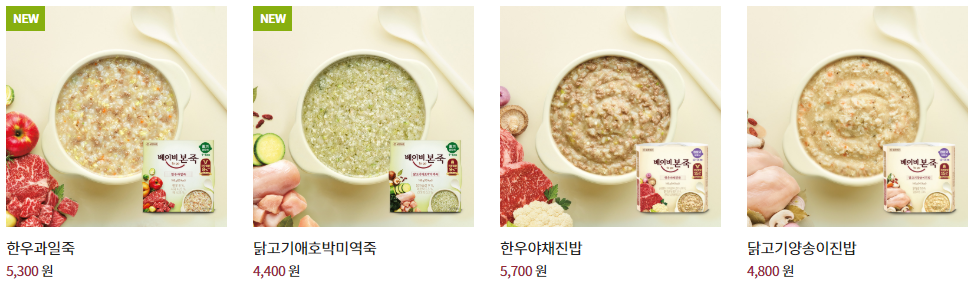| 한우과일죽 | 닭고기애호박미역죽 | 한우야채진밥 | 닭고기양송이진밥 |
