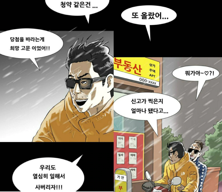 '나 혼자 산다'를 통해 잘 알려진 인기 방송인이자 웹툰 작가인 '기안 84'의 웹툰에는 대통령, 대깨문 등을 포함해 정부 정책을 풍자하는 내용이 계속 이어지고 있다. 그 주된 내용은 비정상적인 아파트 값 상승으로 나타난 사회적 갈등 문제이다.