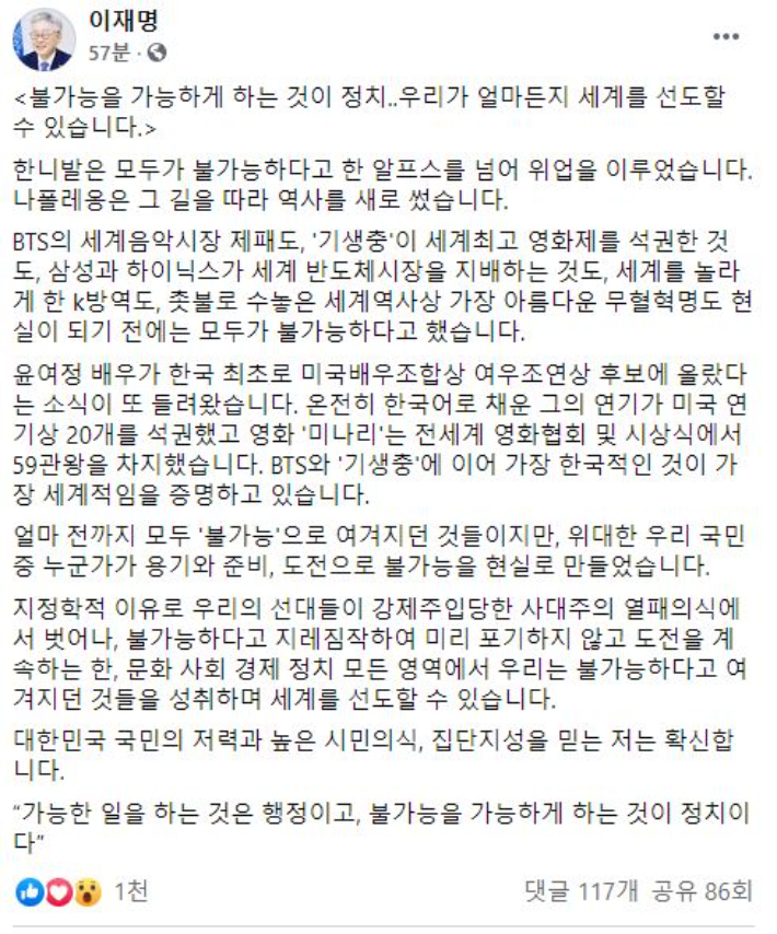 한니발은 모두가 불가능하다고 한 알프스를 넘어 위업을 이루었습니다. 나폴레옹은 그 길을 따라 역사를 새로 썼습니다. BTS의 세계음악시장 제패도, '기생충'이 세계 최고 영화제를 석권한 것도, 삼성과 하이닉스가 세계 반도체시장을 지배하는 것도, 세계를 놀라게 한 K방역도, 촛불로 수놓은 세계역사상 가장 아름다운 무혈혁명도 현실이 되기 전에는 모두가 불가능하다고 했습니다.