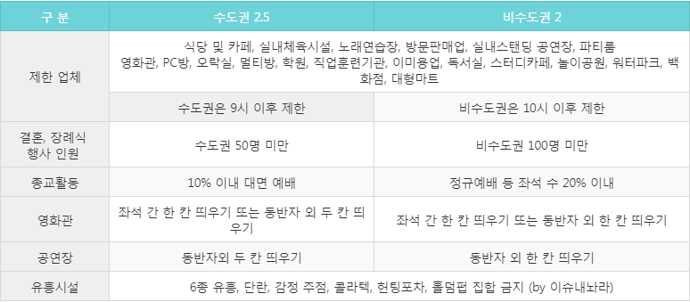 | 제한 업체 | 식당 및 카페, 실내체육시설, 노래연습장, 방문판매업, 실내스탠딩 공연장, 파티룸 영화관, PC방, 오락실, 멀티방, 학원, 직업훈련기관, 이미용업, 독서실, 스터디카페, 놀이공원, 워터파크, 백화점, 대형마트 |