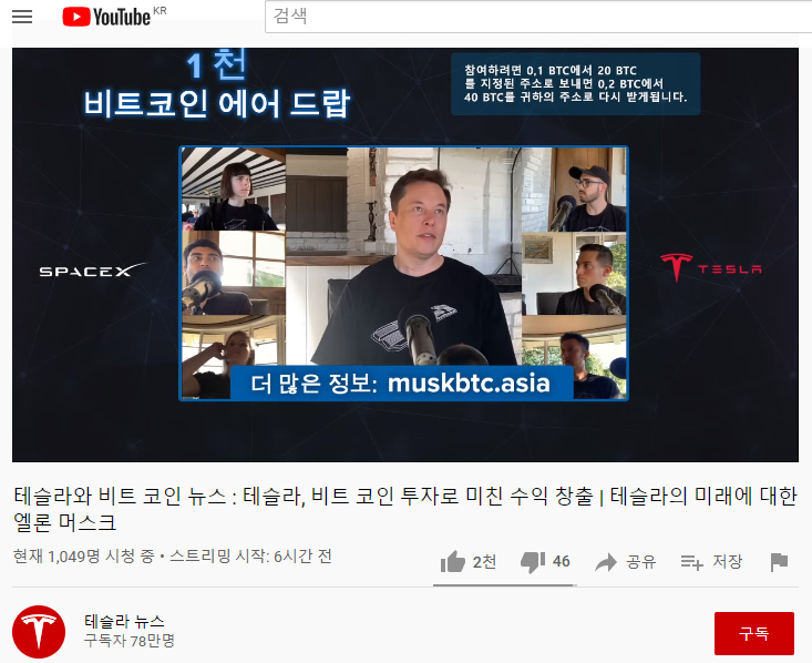 테슬라 일론 머스크 '비트코인 에어 드랍' 사기가 판을 치고 있습니다.