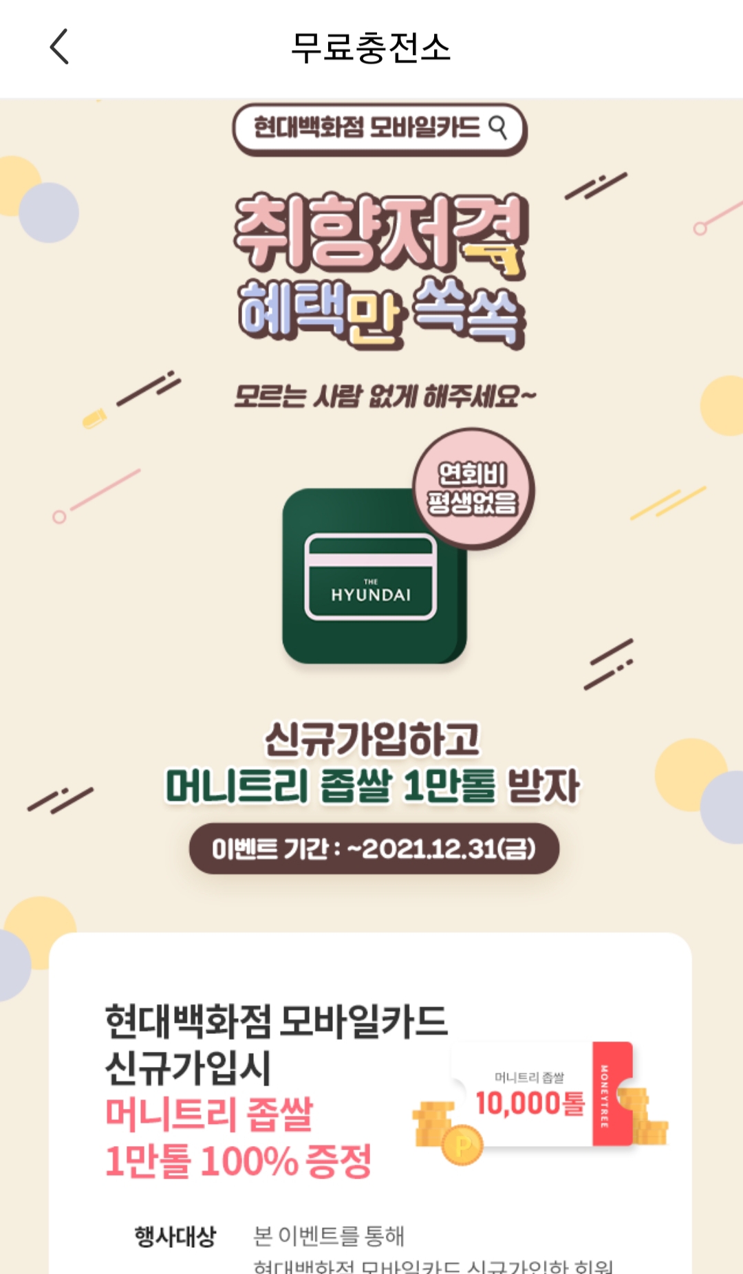 다행스러운건 아래와 같이 전체메뉴에서 무료충전소로 가면 여러 이벤트가 있으므로 쉽게? 좁쌀을 얻을 수 있답니다. 연회비와 가입금이 없는 현대백화점 모바일카드를 발급받으면 1만 톨의 좁쌀을 얻을 수 있습니다. 익월 25일에 받을 수 있겠네요.