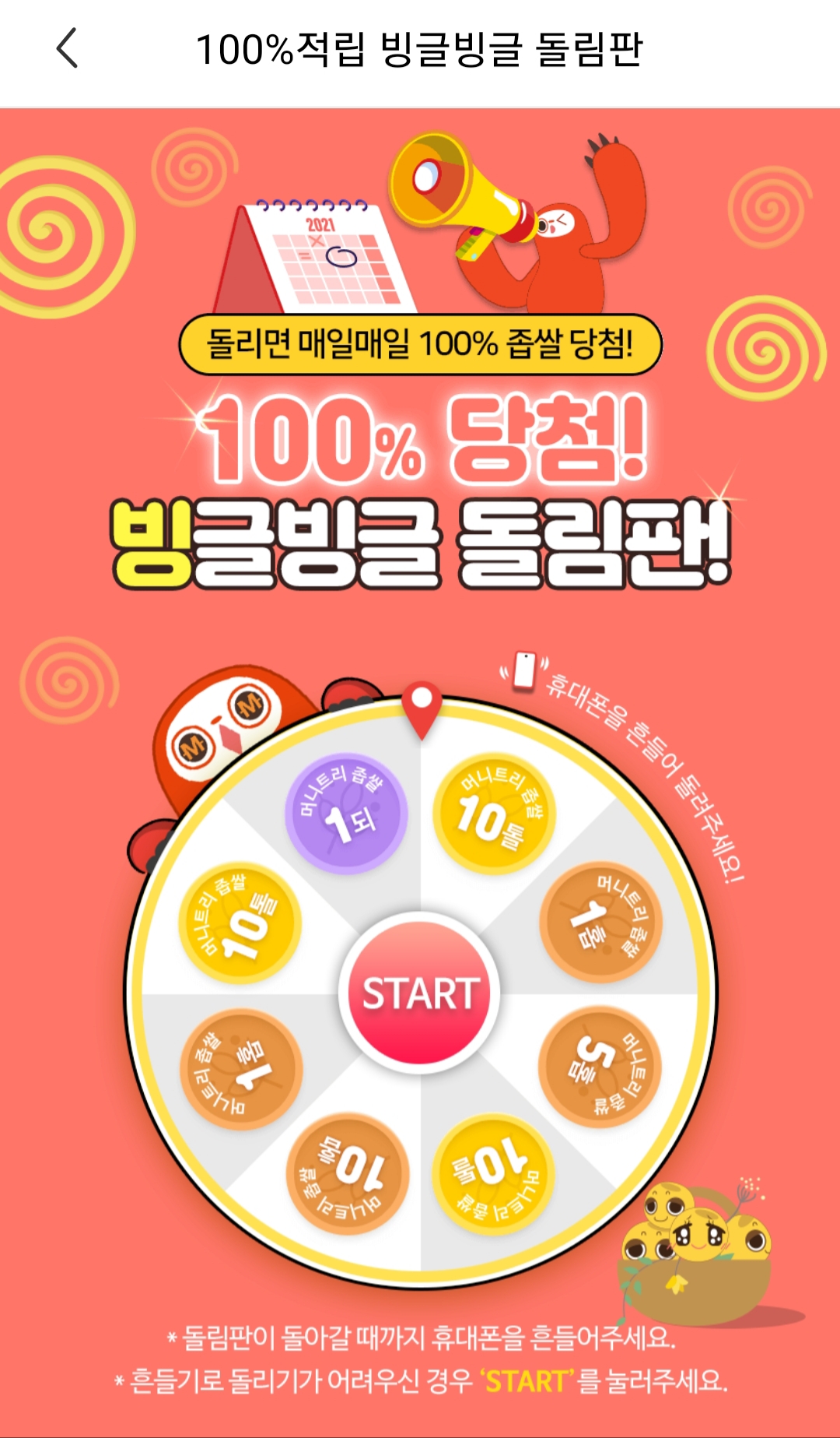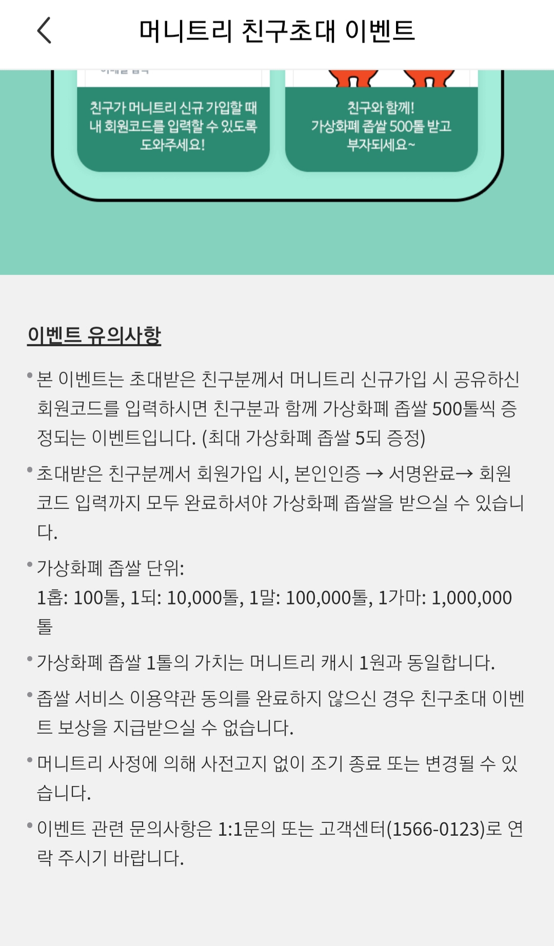 좁쌀 1톨은 1원의 가치를 지니고 출발합니다. 지금은 이벤트 참여만으로도 10,000톨 이상을 얻을 수 있으니, 만약 지금 머니트리에 가입한 뒤 이벤트 몇 개만 참여하더라도 10만원 이상의 수익을 얻게 된다는 뜻이됩니다.