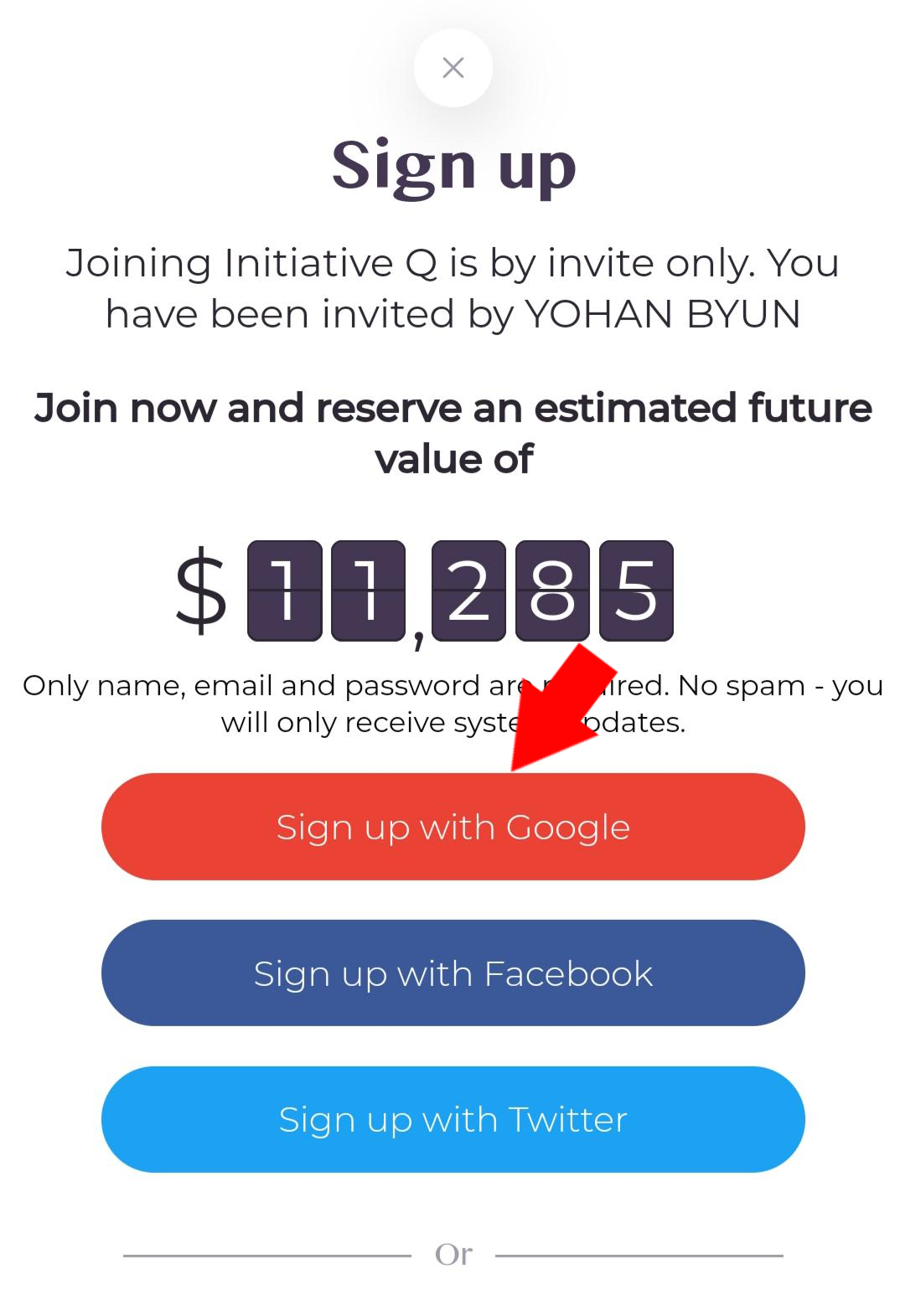 추천 링크(https://initiativeq.com/invite/nGNn_Jtan)를 따라 가시면 아래와 같은 가입 화면이 나오는데, 화살표를 차례대로 클릭하면 됩니다.
