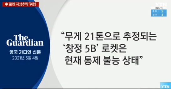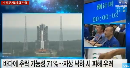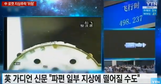 하지만 무게가 21톤으로 추정되는 중국의 로켓은 현재 통제 불능 상태에 놓여있기 때문에, 파편 일부가 지상에 떨어질 가능성도 있다고 영국 가디언 신문은 보도했다. (영국 가디언 신문 5월 4일 자)