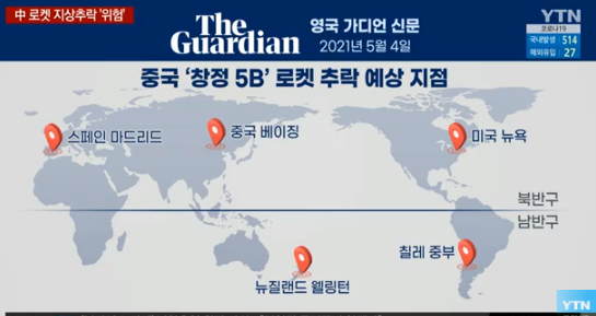 가디언 신문이 예상한 중국 '창정 5B' 로켓 추락 예상 지점은 북반구에서는 미국 뉴욕, 중국 베이징, 스페인 마드리드이며 남반구에서는 칠레 중부, 뉴질랜드 웰링턴이다.