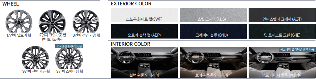 | 스타일 | 노블레스 라이트· 노블레스 | 순차점등 턴시그널(프론트/리어), 다이내믹 웰컴 라이트, 245/45 R18 타이어&전면가공 휠, 고급 우드그레인 내장재, 앰비언트 라이트 |