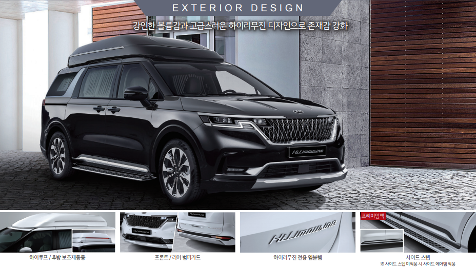 | 프리미엄팩 | 사이드 스텝, 1열/2열 냉·온 컵홀더, 하이리무진 전용 승하차 스팟램프(슬라이딩 도어) | 120만 | 128만 |