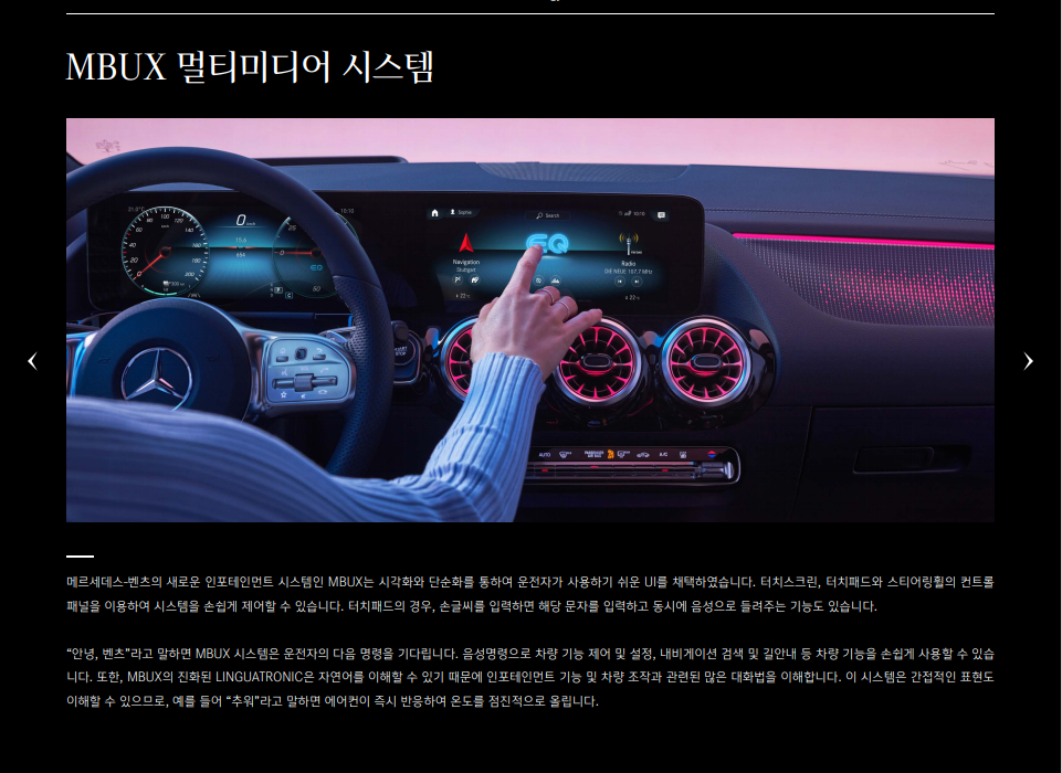 메르세데스 벤츠의 새로운 인포테인먼트 시스템인 MBUX는 시각화와 단순화를 통하여 운전자가 사용하기 쉬운 UI를 채택하였습니다. 터치스크린, 터치패드와 스티어링휠의 컨트롤 패널을 이용하여 시스템을 손쉽게 제어할 수 있습니다. 터치패드의 경우, 손글씨를 입력하면 해당 문자를 입력하고 동시에 음성으로 들려주는 기능도 있습니다.
