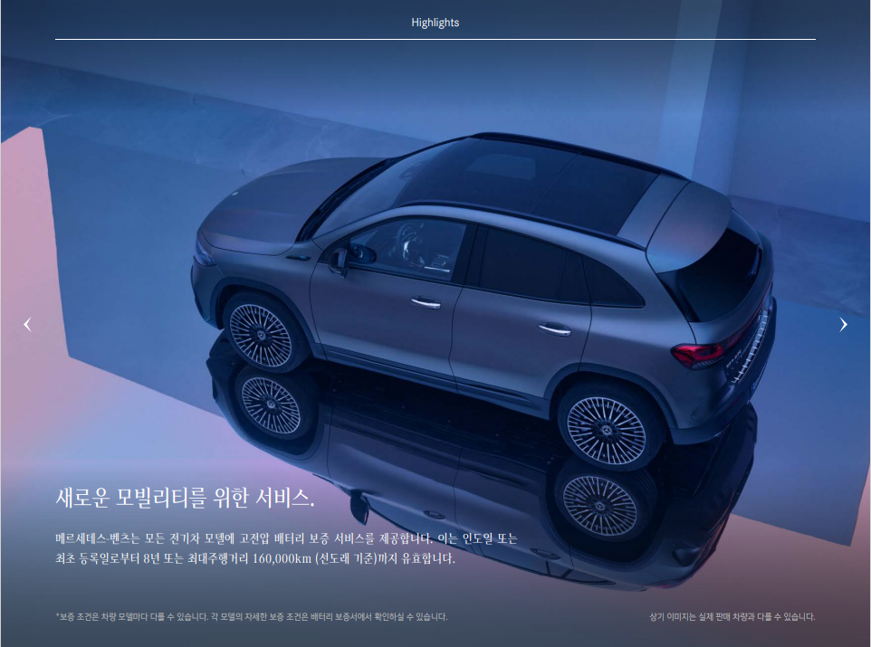 메르세데스 벤츠는 모든 전기차 모델에 고전압 배터리 보증 서비스를 제공합니다. 이는 인도일 또는 최초 등록일로부터 8년 또는 최대주행거리 160,000(선도래 기준)까지 유효합니다. (보증 조건은 차량 모델마다 다를 수 있습니다. 각 모델의 자세한 보증 조건은 배터리 보증서에서 확인하실 수 있습니다.)