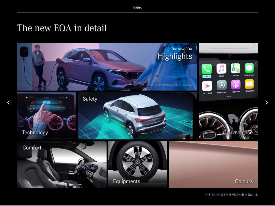 The new EQA는 도시 생활을 새롭게 정의합니다. 완전한 전기 충전식으로 탄소를 배출하지 않고, 소음도 없습니다. 다이내믹한 드라이빙과 편리한 충전 서비스로 더 먼 곳까지 갈 수 있는 전기차의 시대, 바로 지금입니다.