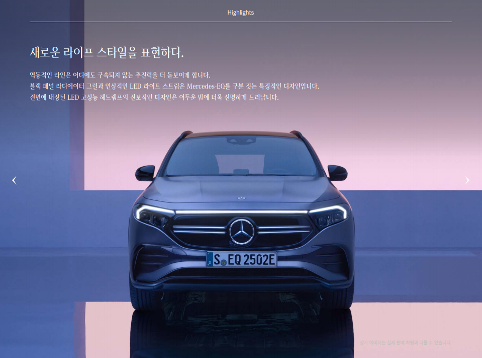 블랙 패널 라디에이터 그릴과 인상적인 LED 라이트 스트립은 Mercedes EQ를 구분짓는 특징적인 디자인입니다.