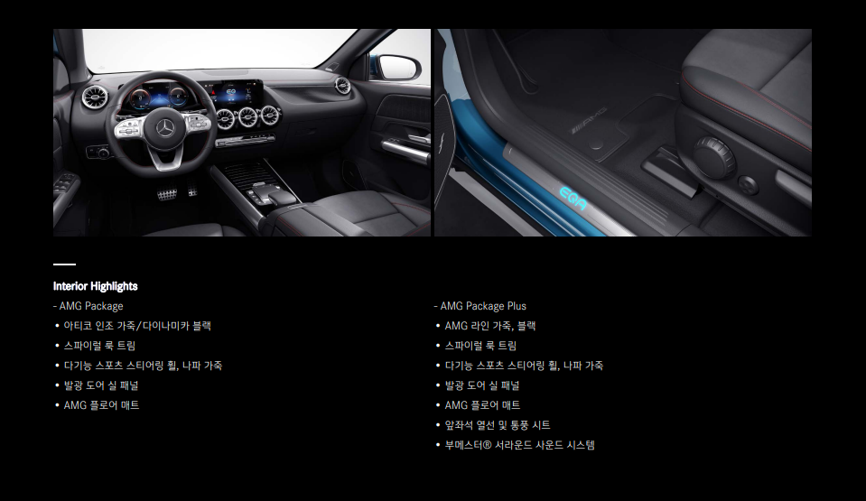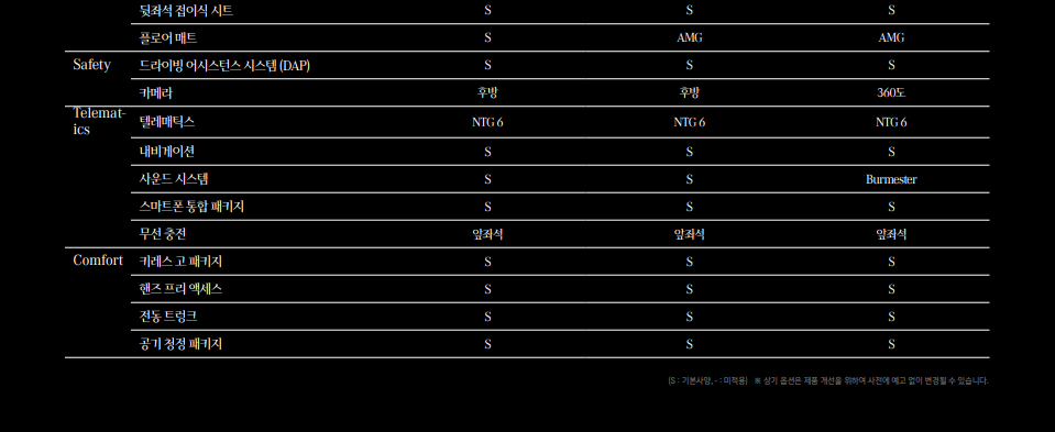 - AMG Package (아티코 인조 가죽/다이나미카 블랙, 스파이럴 룩 트림, 다기능 스포츠 스티어링 휠, 나파 가죽, 발광 도어 실 패널, AMG 플로어 패드)