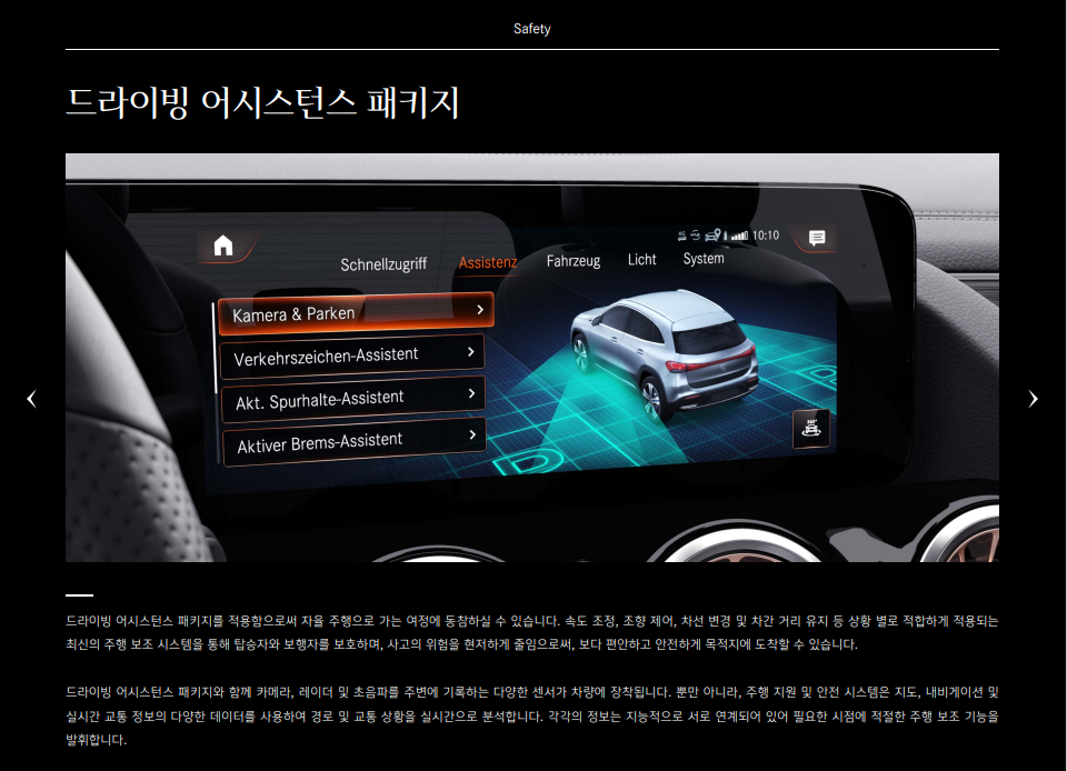 드라이빙 어시스턴스 패키지와 함께 카메라, 레이더 및 초음파를 주변에 기록하는 다양한 센서가 차량에 장착됩니다. 뿐만 아니라, 주행 지원 및 안전 시스템은 지도, 내비게이션 및 실시간 교통 정보의 다양한 데이터를 사용하여 경로 및 교통 상황을 실시간으로 분석합니다. 각각의 정보는 지능적으로 서로 연계되어 있어 필요한 시점에 적절한 주행 보조 기능을 발휘합니다.