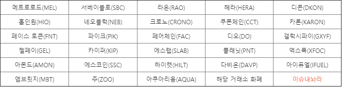 | 엠브릿지(MBT) | 주(ZOO) | 아쿠아리움(AQUA) | 해당 거래소 화폐 | 이슈내놔라 |
