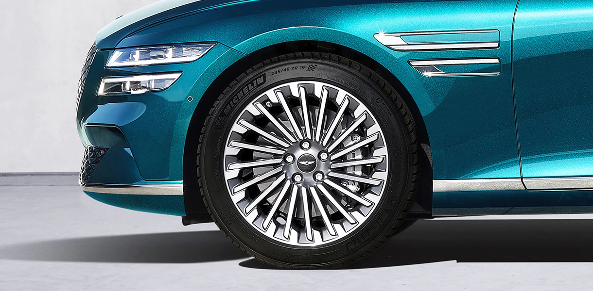 터빈 형상의 19인치 전용 휠, 자연에서 영감을 받은 마티라 블루 전용 컬러는제네시스만의 차별화된 전기차 이미지를 구현합니다.