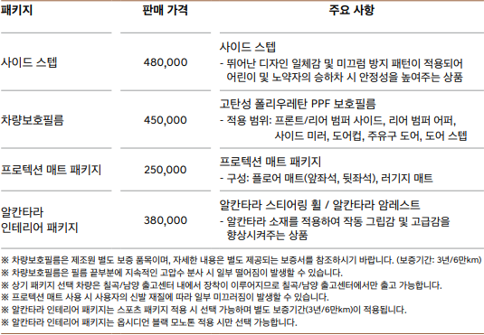 아웃도어 패키지 ▶ 러기지 매트, 러기지 스크린, 뒷좌석 220V 파워아웃렛 | 400,000 |