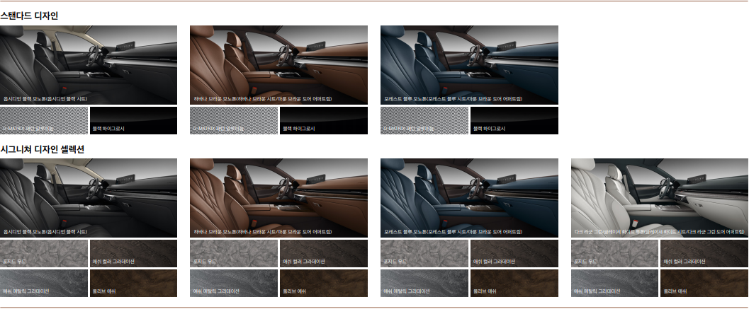 | 시그니쳐 디자인 셀렉션 - 프라임 나파 가죽 시트(퀼팅, 파이핑 적용), 프라임 나파 가죽 내장재 (센터콘솔 암레스트, 스티어링 휠 혼 커버), 오픈포어 리얼우드 내장재, 럭셔리 스웨이드 내장재(헤드라이닝, 필라 트림 등), 인조가죽 내장재(크래쉬패드, 도어 센터트림) |
