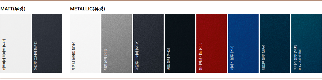 | 메탈릭 컬러(유광, 7종 중 선택) - EV 스페셜 컬러(마티라 블루) 매트 컬러(무광, 2종 중 선택: 베르비에 화이트, 마칼루 그레이) |