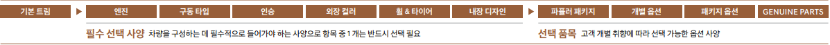 ※ 엔진 / 구동 타입 / 인승 / 외장 컬러 / 휠 & 타이어 / 내장 디자인은 반드시 각각 1개씩 선택이 필요합니다.
