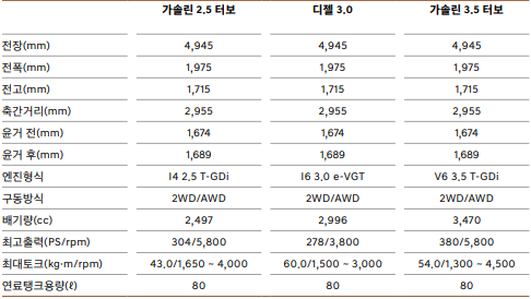 파워트레인 및 성능 | 가솔린 2.5 터보 엔진, 8단 자동변속기, 프리뷰 전자제어 서스펜션, 전동식 파워 스티어링(R-MDPS), ISG 시스템, 통합 주행 모드 |
