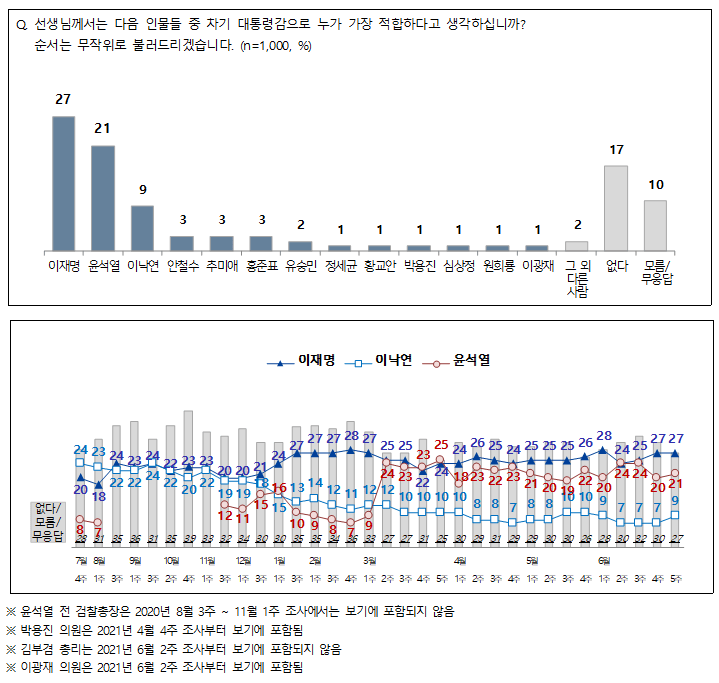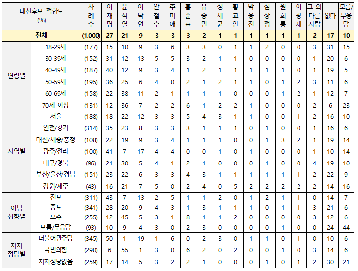 | 1 | 윤석열 | 29.9% | -1.5% |
