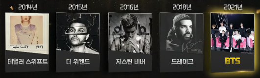 2016년 저스틴 비버, 2018년 드레이크, 2021년 BTS 이다.