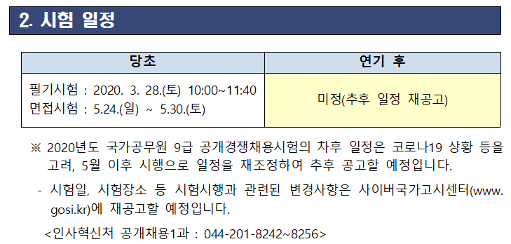 인사혁신처가 2020년도 국가공무원 9급 일정을 5월 이후로 연기한다고 합니다