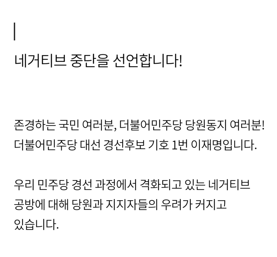 또한 경선보다 중요한 본선 승리를 위해 네거티브 공세에도 반격을 최대한 자제했습니다. 흑색선전에 가까운 과도한 네거티브 공격에 맞선 최소한의 방어조치로서 진실에 기초한 문제제기를 했지만 이마저도 국민들 보시기에 불편하신 것같습니다.