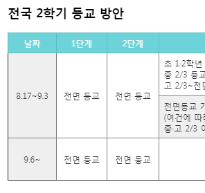 | 8.17~9.3 | 전면 등교 | 초 3~6 3/4 등교 중 2/3 등교 고 1·2 1/2~전면 등교 |
