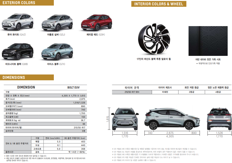 ● 성능 : 150kW 고성능 싱글 모터, 66kWh 리튬이온 배터리, 버튼식 기어시프트, 속도 감응형 전자식 파워 스티어링(EPS), 스포츠 모드, 원페달 드라이빙 모드, 리젠 온 디맨드 패들시프트, 액티브 에어로 셔터 ● 안전 사양 : 10 에어백(앞좌석 어드밴스드, 앞좌석 무릎, 앞/뒷좌석 사이드, 좌우 커튼, 전복감지센서 포함), 셀프실링 타이어, 디지털 서라운드 비전 카메라, 차선 변경 및 사각지대 경고, 후측방 경고, 차선 이탈 방지 경고 및 보조, 전방 충돌 경고(헤드업 LED 경고등 포함), 전방 거리 감지, 저속 자동 긴급 제동, 전방 보행자 감지 및 제동, IntelliBeam® 하이빔 어시스트, 뒷좌석 승객 리마인더, 타이어 공기압 모니터링(적정공기압 알림 포함), StabiliTrak® 차체 자세 제어, 후방 주차 거리 경고, 디스크 브레이크(전륜/후륜), 보행자 보호 가상 사운드 ● 외관 사양 : 블랙 보타이, 17"머신드 투톤 알로이 휠 & 미쉐린 저구름저항 타이어, LED 프로젝션 헤드램프, LED 시퀀셜 방향지시등(전면), LED 주간주행등, LED 보조제동등, LED 리어램프, LED 방향지시등 일체형 아웃사이드 미러(전동접이식/열선내장), 리어 스포일러, 루프랙, 크롬 스트립 도어핸들, 크롬 사이드 바디몰딩, 실버 메탈릭 스키드 플레이트, 리어 와이퍼 & 워셔, 자외선 차단 유리(전체적용), 이중접합 차음유리(윈드실드) ● 내장 사양 : D컷 스티어링 휠 & 블랙 보타이, 어반 네이비 인테리어, 천연 가죽시트, 도어 & IP 가죽 포인트, 8"디지털 클러스터, 앰비언트 라이팅, 크롬 도어핸들, 맵램프, 룸램프, 트렁크 룸램프, 트렁크 폴딩 트레이 ● 편의 사양 : 어댑티브 크루즈 컨트롤(정차 및 재출발/전방 차량 출발 알림 포함), 버튼시동 & 스마트키, 전자식 주차 브레이크, 스마트폰 무선 충전, 풀오토 에어컨, 클러스터 이오나이저, 앞좌석 3단 열선/통풍 시트, 뒷좌석 열선 시트, 운전석 8way 전동시트 & 2way 럼버서포트, 열선 가죽 스티어링 휠, 스티어링 휠 오디오 리모트 컨트롤, 틸트 & 텔레스코픽 스티어링 휠, 오토라이트 컨트롤, 톨게이트 자동결제 시스템, ECM 룸미러, 레인센싱 와이퍼, 앞좌석 세이프티 파워윈도우, 뒷좌석 원터치 다운 파워윈도우, 뒷좌석 6:4 폴딩, 뒷좌석 암레스트, 선바이저 LED 조명 ● 멀티미디어 : EV전용 쉐보레 인포테인먼트 시스템(10.2"고화질 터치스크린), 무선 폰 프로젝션, 듀얼커넥션 블루투스, 6 스피커, 앞/뒷좌석 듀얼 USB 포트(A, C타입) |